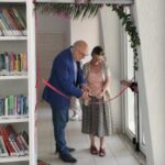 Taglio del nastro per la biblioteca di istituto alla presenza del ds Marra e della direttrice editoriale della Sinnos, Della Passarelli